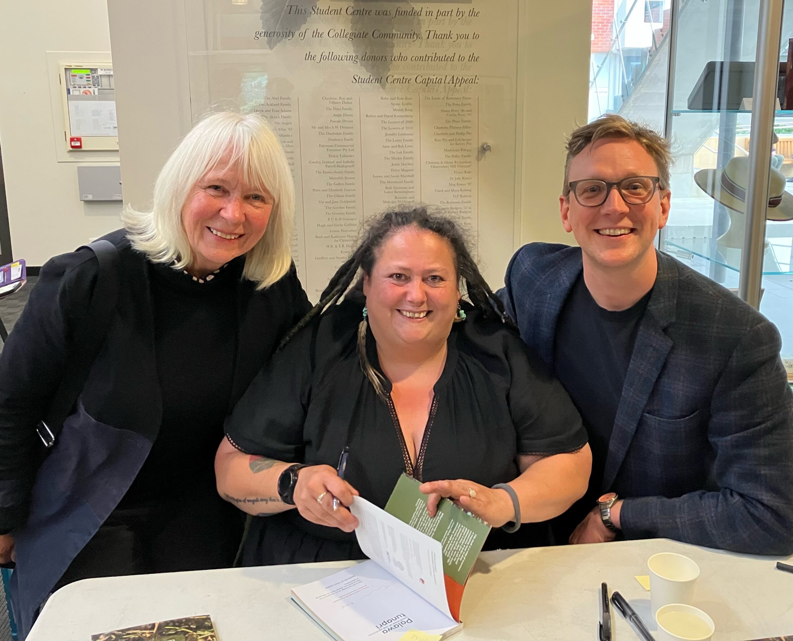 Prue Slatyer, Trish Hodge and Tim Jarvis at the launch of Palawa tunapri Trish Hodge’s book Palawa...